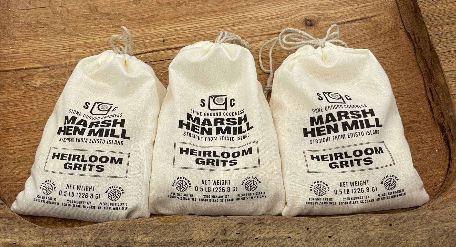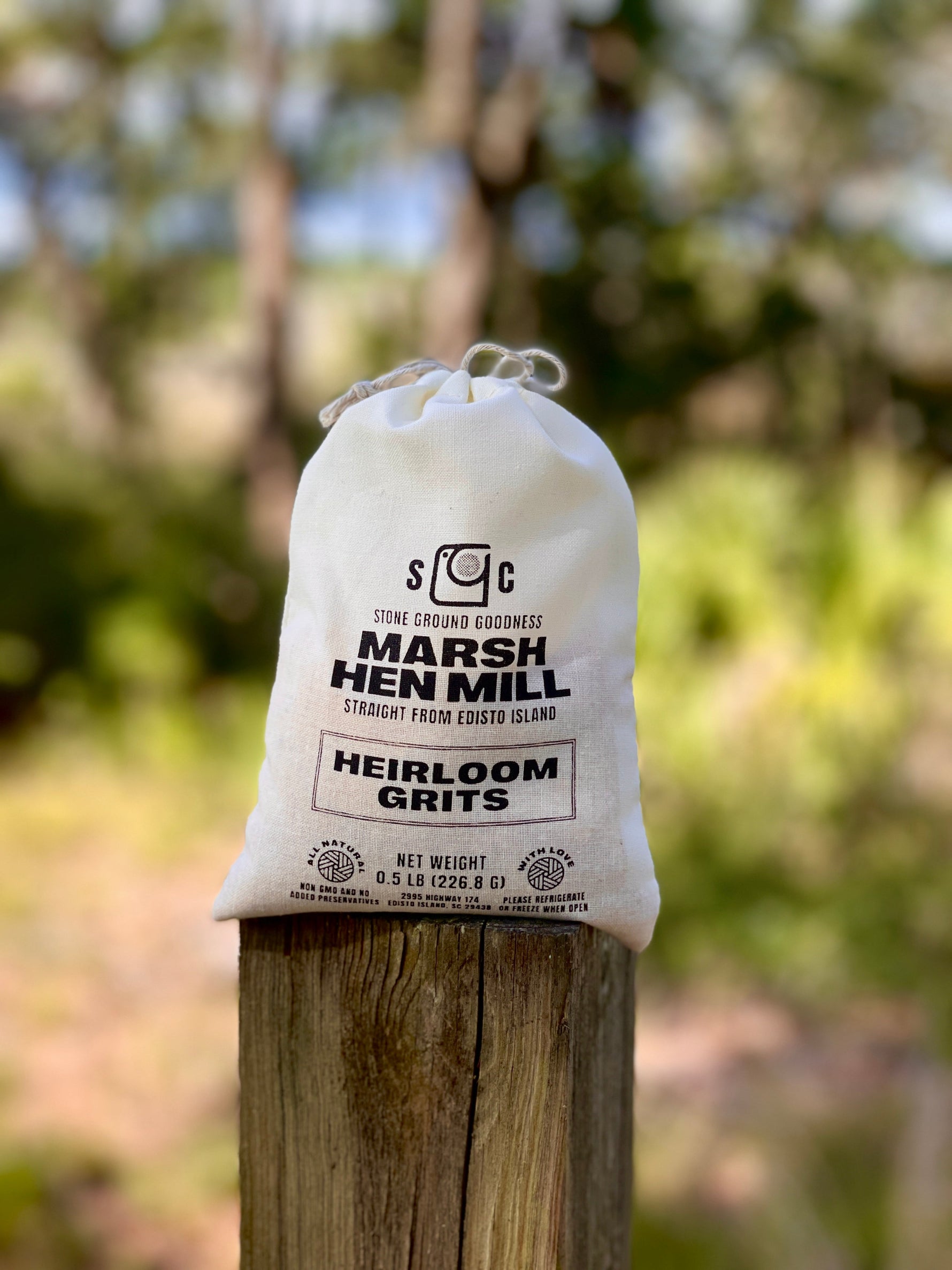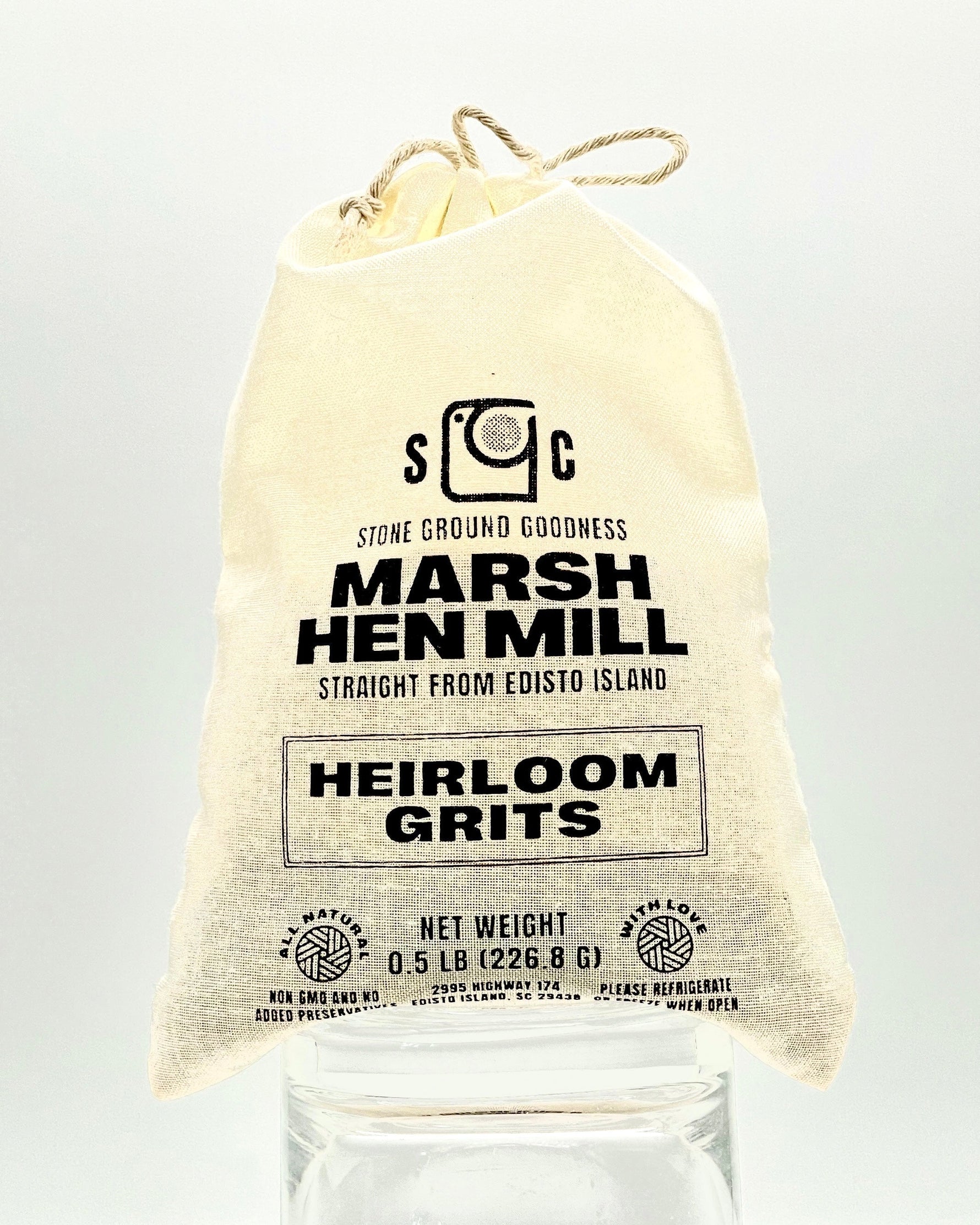 This throwback 1/2 pound cloth bag makes a perfect gift. Each bag is packed with our Stone Ground Guinea Flint grits and hand tied.