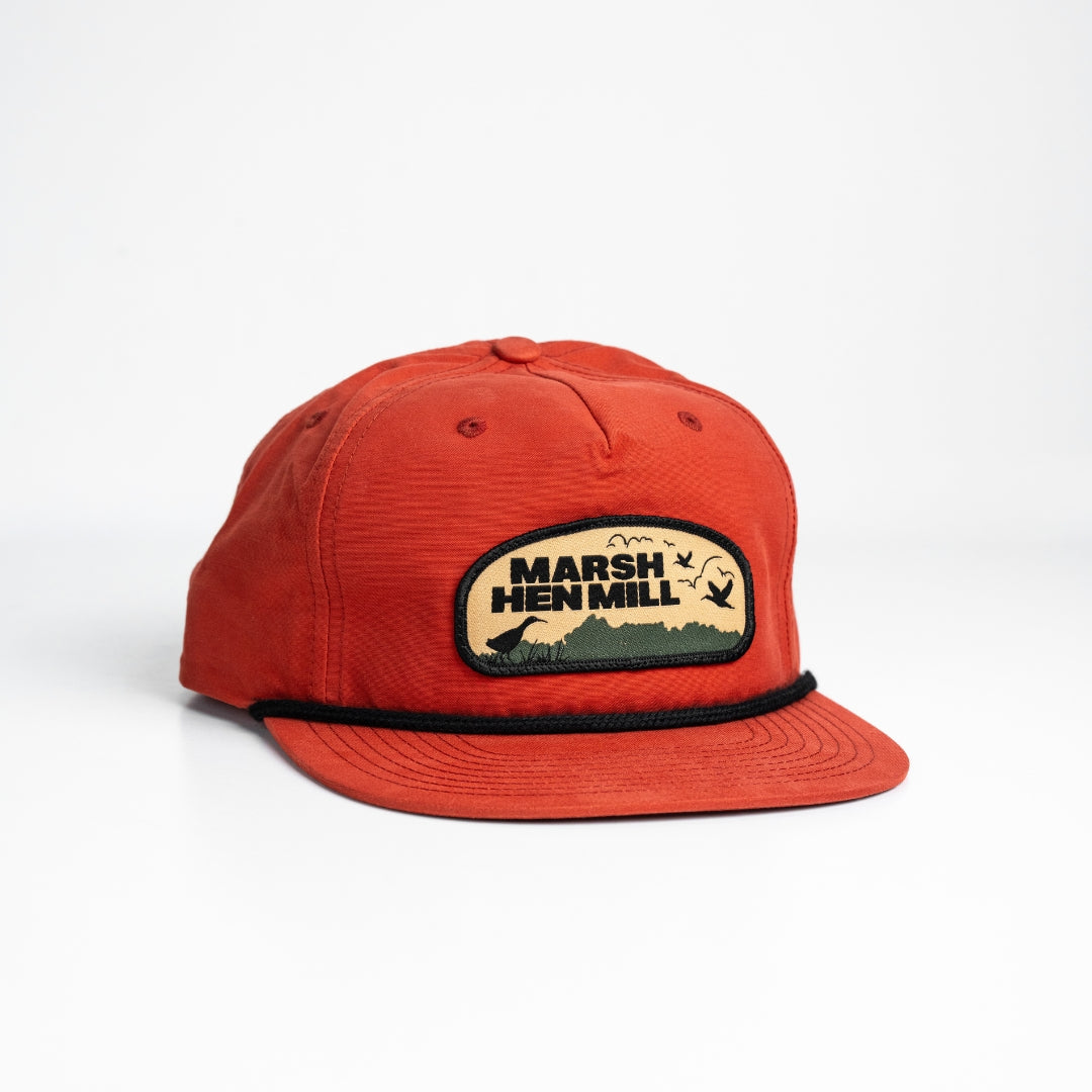 You will stand out in town or out in the marsh in this burnt-orange beauty. The marsh scene patch is reminiscent of high tide in the Lowcountry. Get yours while you can.
