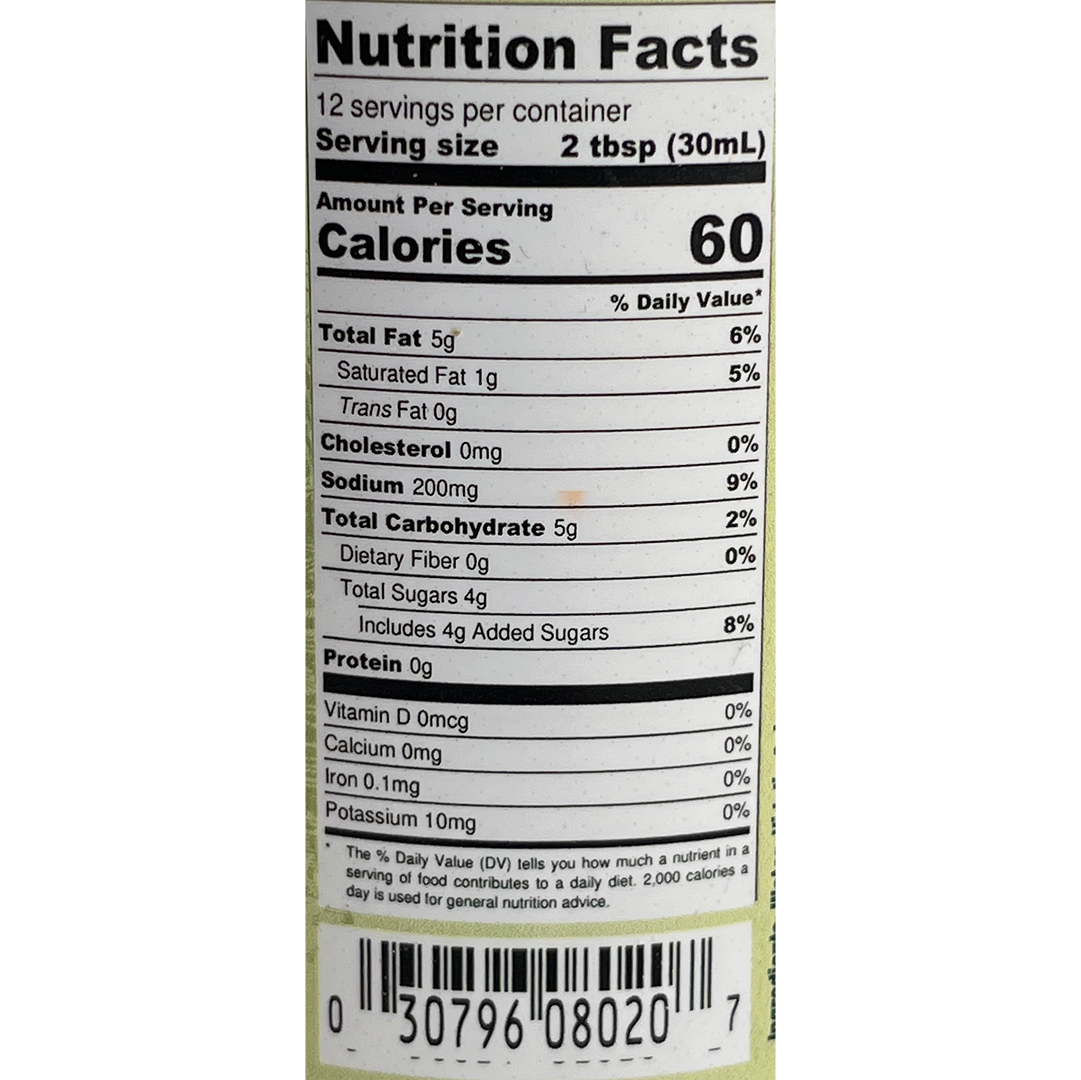 Ingredients: Water, Vidalia Onion (18%), cucumber juice from concentrate, soybean oil, sugar, vinegar, salt, xanthan gum, dill weed, sodium benzoate as a preservative, EDTA added to protect flavor. Contains Soy.