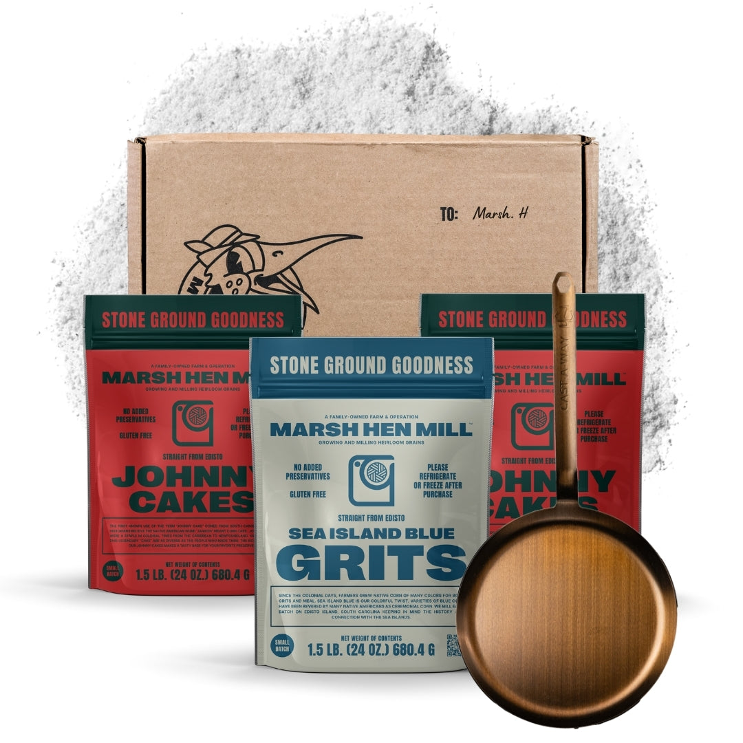 • Marsh Hen Mill Sea Island Blue Grits – vibrant, award-winning heirloom flavor.    •Marsh Hen Mill Tea Towel – for hot pans or happy hands